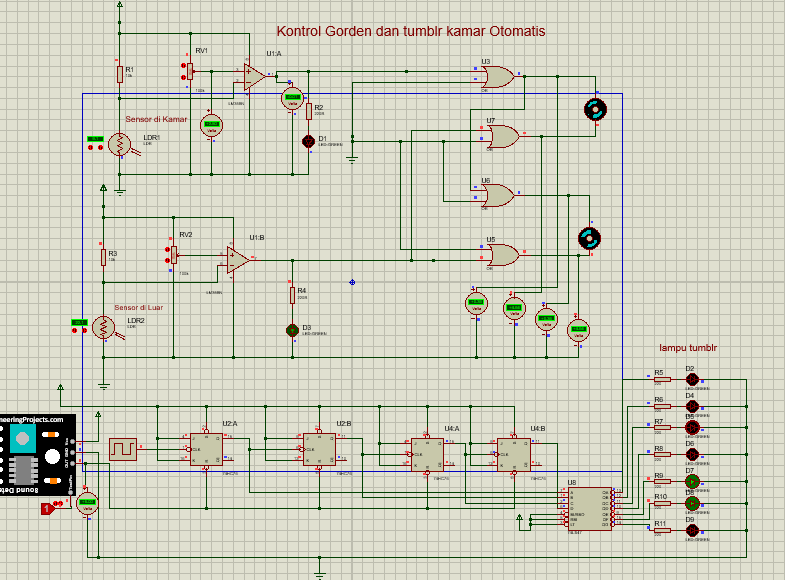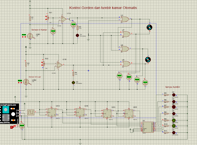 Saat sensor A mendeteksi adanya cahaya di dalam kamar dari lampu, maka cahaya akan masuk ke LDR. Saat LDR mendapatkan cahaya dengan intensitas tinggi maka resistansi LDR akan kecil sehingga arus dari Vcc dapat mengalir. Arus kemudian masuk ke potensiometer dan ke op-amp. Op-amp pada rangkaian berfungsi sebagai komparator. Tegangan dari Vcc kemudian masuk ke op-amp dan dibandingkan dengan tegangan pada potensiometer. Karena resistansi LDR kecil maka tegangan yang mengalir ke kaki negatif op amp menjadi besar dan sesuai prinsip kerja komparator maka output dari op-amp adalah tegangan yang besar maka LED 1 menyala sebagai indikator di dalam kamar lampu hidup. Logika 1 kemudian masuk ke input 1 gerbang OR 1 dan input 2 mendapat logika 0 dari ground sehingga output nya adalah logika 1 yang memutar motor secara clockwise dan menutup gorden. Sedangkan sensor di luar ruangan tidak mendapatkan cahaya karena keadaan gelap di malam hari, sehingga resistansi LDR besar dan arus dari Vcc tidak dapat mengalir ke potensiometer dan Op-amp sehingga tidak ada juga arus yang mengalir dari output op-amp (sangat kecil) sehingga input2 gerbang OR4 berlogika 0 dan input 1 gerbang OR 4 juga mendapat logika 0 dari ground maka motor mengikuti arah putaran motor 1 yaitu clockwise dan gorden tertutup.