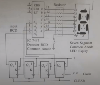 Q3 dihubungkan ke pin C, dan Q4 dihubungkan ke pin D. Output IC 74LS47 kemudian