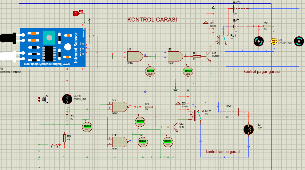 tegangan pada sensor diteruskan menjadi input bagi gerbang nand 1 (U1) sehingga